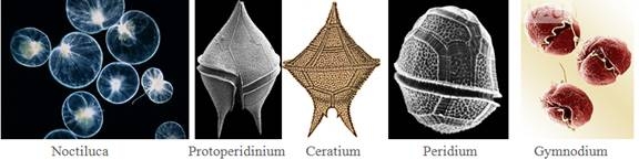 - Có khoảng 2000 loại tảo giáp được biết đến, trong đó có 60 loài có khả năng sản sinh độc tố phức tạp, là một nhóm tảo rất bền. Sự bùng nổ của quần thể hoặc nở hoa khi gặp điều kiện thuận lợi làm cho cá và động vật có vỏ nhiễm bẩn gây nguy hiểm cho sức khỏe con người và động vật như Gymnodinium, Peridium, Ceratium, Protoperidinium, Alexandrium, Chaetoceros,…